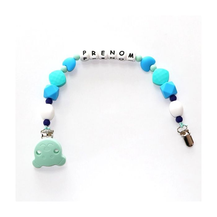 Attache doudou Silicone naturel, avec Prénom de bébé, bleu