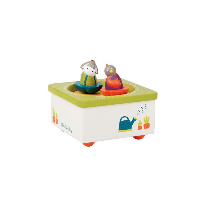 Un cadeau naissance très utile et qui dure ! Boîte à musique en bois de la marque Moulin Roty. Les personnages dansent pendant la douce mélodie endort bébé.