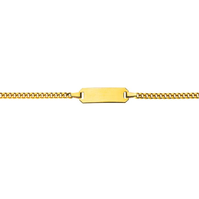 Jolie gourmette en or jaune 375, avec une plaquette à graver de forme rectangulaire. Ce bracelet d'identité est disponible en 3 tailles différentes. Livraison de la gourmette personnalisée: comptez +1/2 jours.