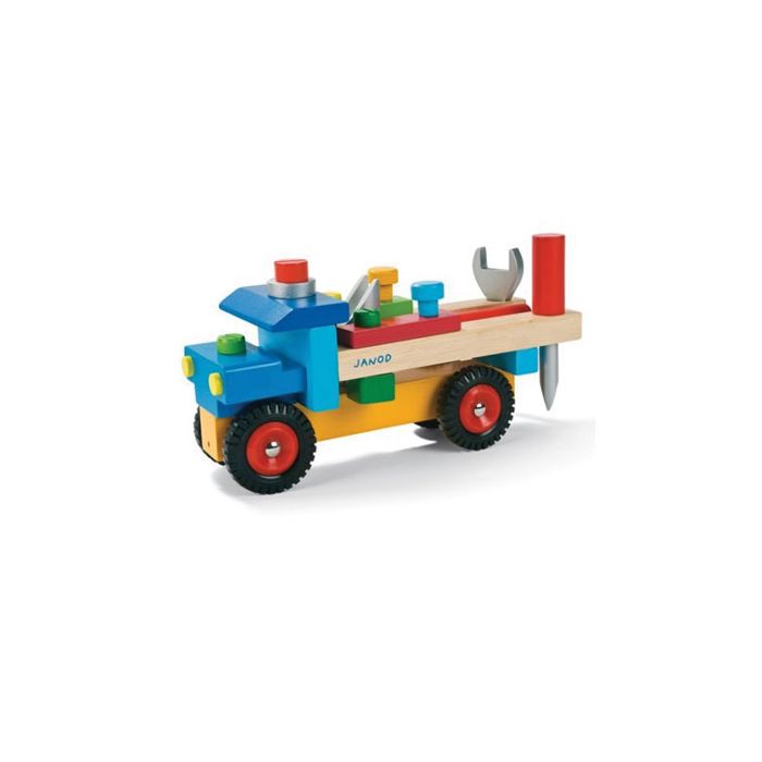 Ce joli camion en bois Janod est fourni avec 3 outils pour bricoler et 13 pièces.