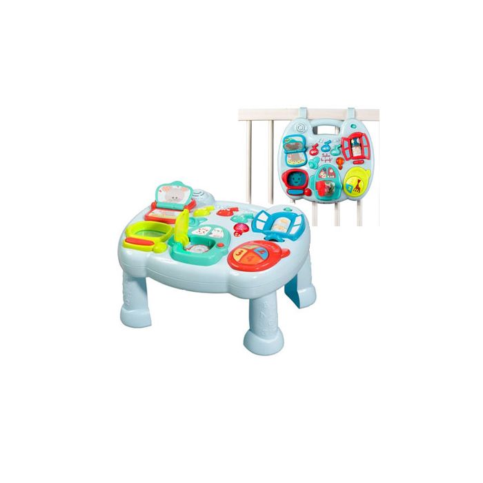 A la fois un tableau d'éveil à accrocher et une table d'activités !De nombreuses activités à découvrir : un livre musical, 3 notes de musique, une cloche qui déclenche 1 mélodie rigolote, un décor à faire défiler pour découvrir la notion de « jour » / « nuit », un téléphone avec des bruits amusants, une porte qui s'ouvre lorsque l'on sonne et qui laisse apparaître Lazare le chat qui miaule quand on le presse. Enfin Sophie la girafe qui fait un clin d'œil accompagnée d'un son rigolo.Evolutif: il s'utilise dans un premier temps comme un tableau d 'éveil qui s'accroche partout grâce aux sangles universelles puis devient une table d'éveil grâce à ses pieds amovibles.Fonctionne sur avec 3 piles AAA/LR6 fournies.Dès 10 mois.