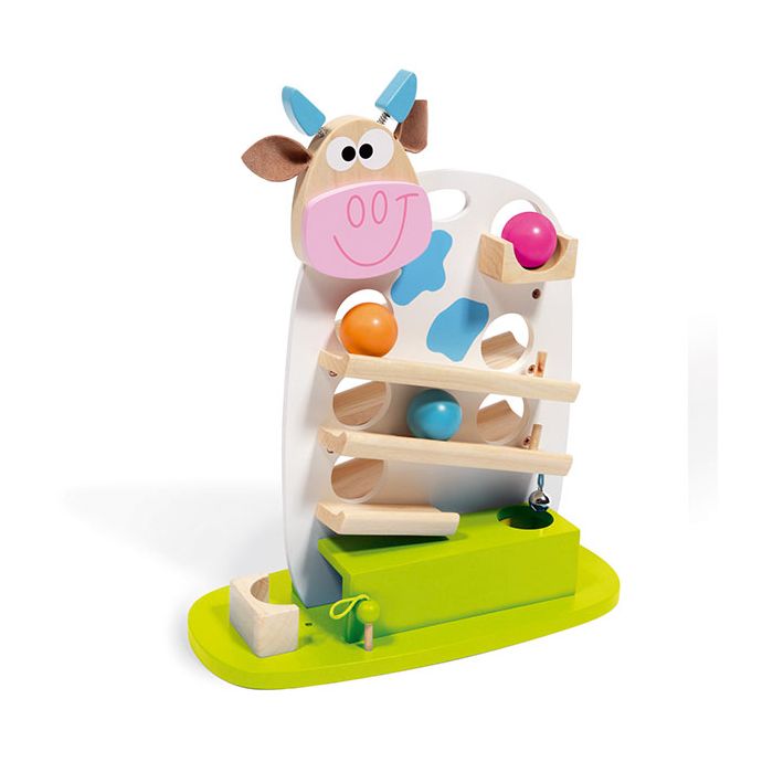 Joue avec Marie la vache grâce à ce chouette circuit à balles. Pousse les balles au-dessus par l’ouverture. Elles roulent le long des deux côtés des toboggans en bois jusqu’en bas. Lorsque les balles atteignent la station finale, une clochette retentit.