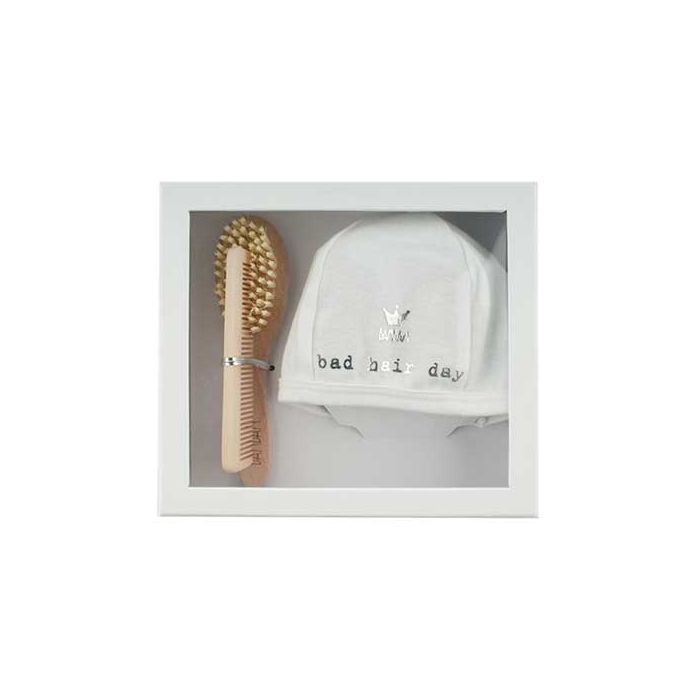 Coffret de naissance de la marque Bambam comprenant un peigne, une brosse ainsi qu'un bonnet de naissance avec l'inscription "bad hair day".