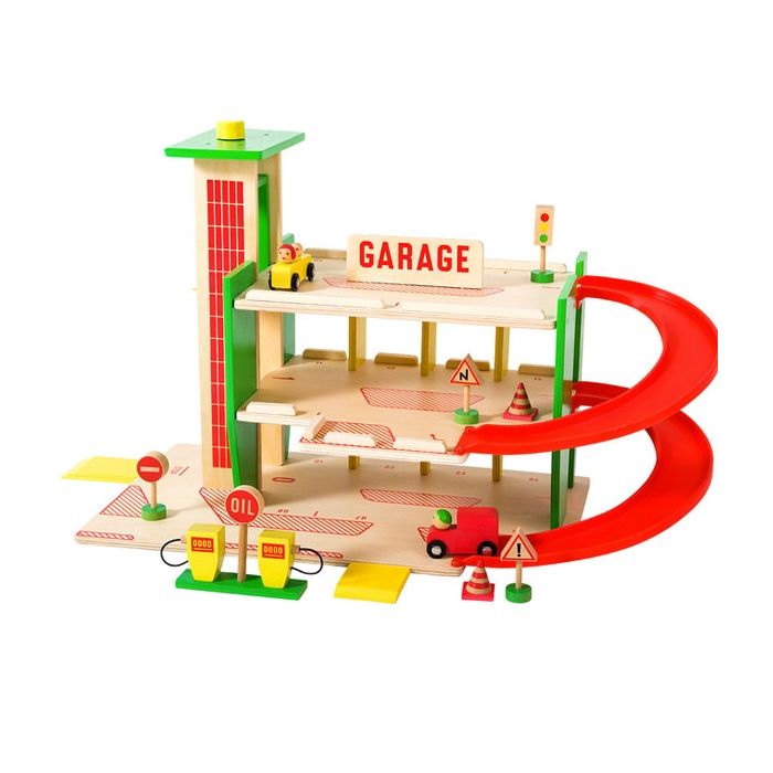 Ce merveilleux garage en bois fera battre le cœur des enfants très très vite. Il y a beaucoup de choses à découvrir, par exemple une pompe à essence, un ascenseur pour voitures, des panneaux de signalisation et bien sûr des voitures.