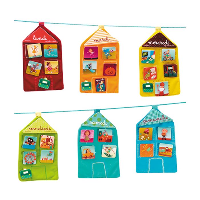 A chaque maison correspond un jour de la semaine : mercredi dentiste, samedi au marché, dimanche chez papi et mamie, amuse-toi à accrocher les petites cartes correspondant à tes activités.