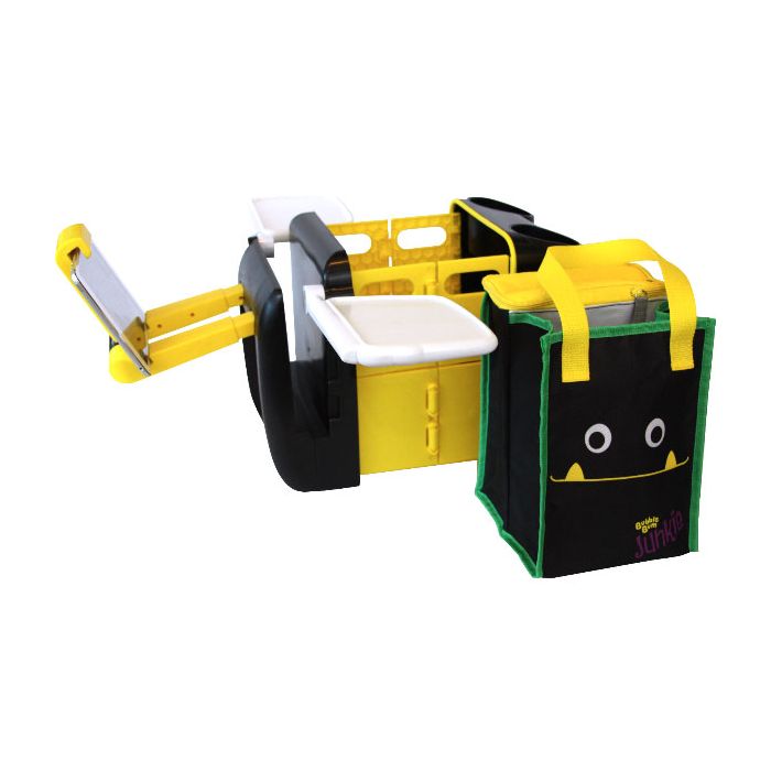 - Se place juste entre les sièges des enfants (ne se fixe pas derrière les sieges, laissant ainsi toutes la place pour les jambes de vos enfants)