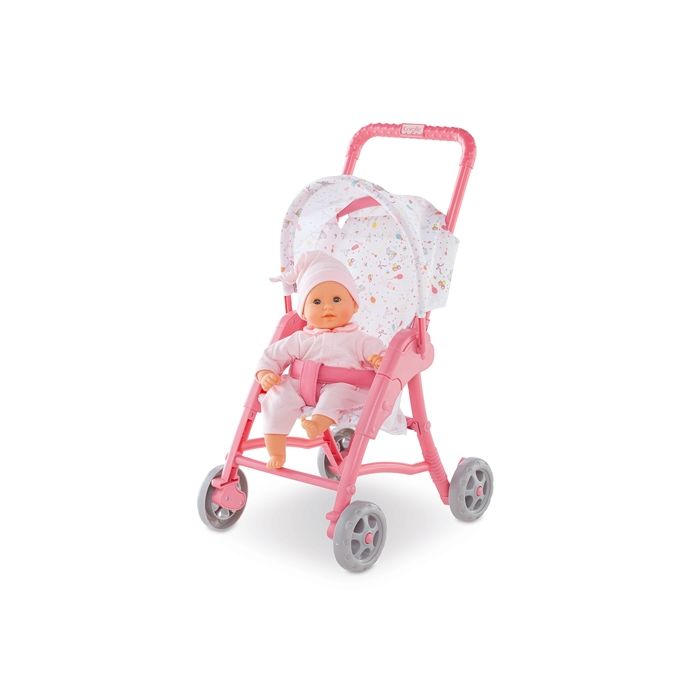 Jolie poussette Corolle, avec capote, pour balader les petits poupons jusqu'à 30 cm. Pratique: la sangle en tissu permet de bien asseoir la poupée. A monter par un adulte. Livrée sans poupée. Dès 18 mois
