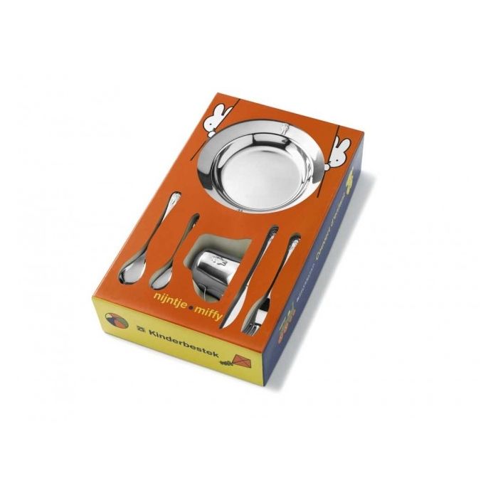 Ensemble de couverts 6 pièces, avec la petite lapine miffy mondialement connue et dessinée par Dick Bruna. Contient un ensemble de couverts 4 pièces, une timbale et une petite assiette. Miffy est représentée sur chacune des pièces.