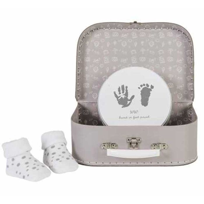 Voila une chouette idée de petit cadeau pour une baby shower même si vous ne savez pas encore si c'est un garçon ou une fille. Petite mallette de voyage en carton solide, 25 cm de large, contenant une jolie paire de chaussettes et un kit pour prendre emprentes pied et main de bébé. Un joli souvenir de naissance que l'enfant et les parents garderont à vie.